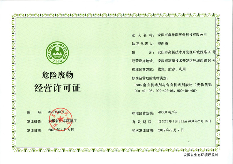 鑫祥瑞環(huán)?,F(xiàn)擁有收集、貯存及利用4萬(wàn)噸/年廢有機(jī)溶劑(HW06)的危廢經(jīng)營(yíng)許可證,可為國(guó)內(nèi)工業(yè)危廢循環(huán)利用提供綜合解決方案。依托自建500平方米現(xiàn)代化技術(shù)研發(fā)檢測(cè)中心,可為用戶提供樣品金屬離子、成分分析、顆粒度、色度檢測(cè)等技術(shù)支持和服務(wù)。申報(bào)廢溶劑處理技術(shù)專利50多項(xiàng),備案產(chǎn)品60多種,具備將工業(yè)級(jí)化學(xué)品精餾提純至電子級(jí)化學(xué)品的研發(fā)生產(chǎn)能力。