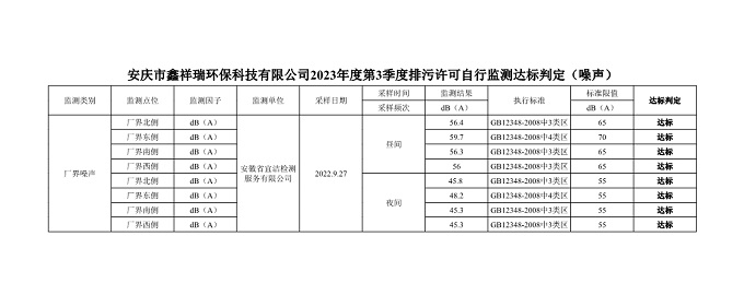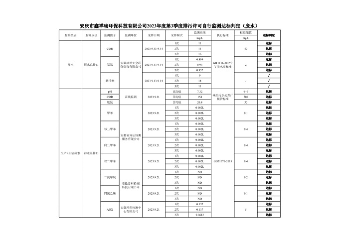 安慶市鑫祥瑞環(huán)??萍加邢薰?023年第3季度排污許可自行監(jiān)測(cè)公開